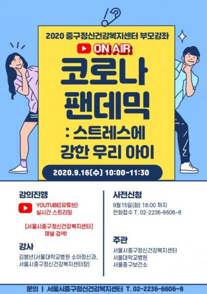 교육은 코로나19로 지역사회 확산 방지를 위해 온라인 유튜브를 통해 실시간 방송되며 오는 16일 수요일 오전 10시부터 '서울시중구정신건강복지센터' 유튜브 채널에서 시청할 수 있다.