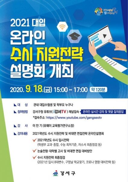 ‘대입 수시 지원전략 설명회’는 오는 18일 오후 3시부터 5시까지 2시간 동안 강서구청 유튜브 i강서TV를 통해 실시간으로 진행한다.
