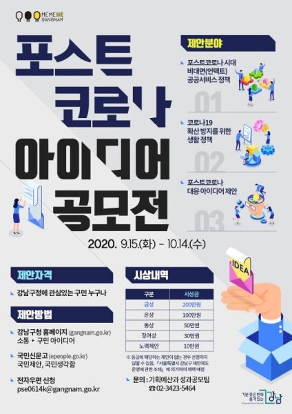 공모분야는 포스트코로나 시대를 대비한 비대면 공공서비스 정책을 비롯해 주민생활에 필요한 제안 등이며 심사를 통해 선정된 우수 아이디어는 강남구 온택트 공공서비스 정책으로 추진된다.