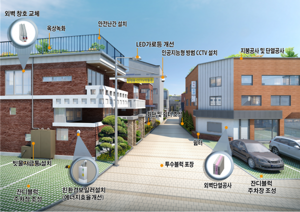 예컨대, 외벽과 창호는 단열 성능이 좋은 제품으로 설치해 난방비 절감효과를 거둘 수 있고 골목길 바닥은 투수블럭으로 포장하며 LED 가로등과 인공지능형 방범CCTV도 설치할 수 있다.