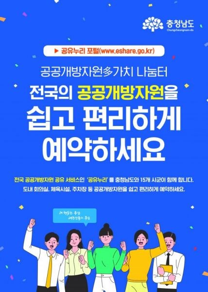 [무한뉴스] 충남도는 도민 누구나 편리하고 저렴하게 도내 공공개방자원을 사용할 수 있도록 실시간 조회·예약이 가능한 통합 공유 포털 ‘공유누리’를 운영 중이라고 15일 밝혔다.