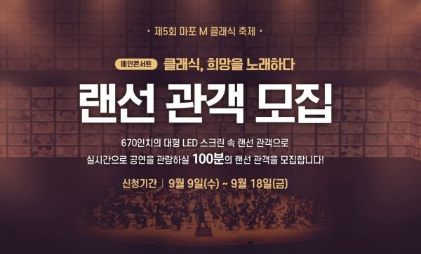 [무한뉴스] 마포구 마포문화재단이 16일부터 오는 10월 15일까지 디지털 컨택트로 진행 예정인 제5회 마포 M 클래식 축제의 메인콘서트 ‘클래식, 희망을 노래하다’에 참여할 랜선 관객 100명을 모집한다.