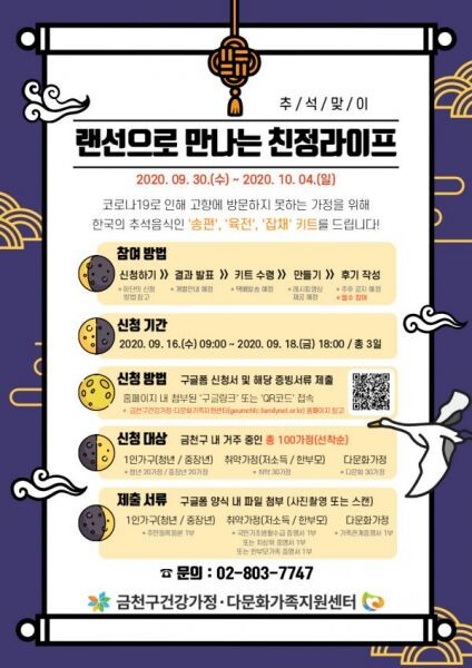[무한뉴스] 금천구는 금천구건강가정·다문화가족지원센터에서 다가오는 추석연휴를 맞아 집콕 이벤트 4탄 ‘랜선으로 만나는 친정라이프’를 운영한다고 밝혔다.