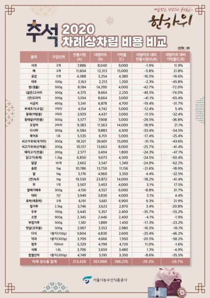 [무한뉴스] 서울시농수산식품공사는 알뜰한 추석 명절 준비에 도움이 되는 정보를 제공하기 위해 서울시내 5개 권역생활권별 7개구 전통시장, 대형마트 및 가락시장 내 가락몰 등 총 22곳을 대상으로 2020년 추석 차례상차림 비용을 조사·발표했다.