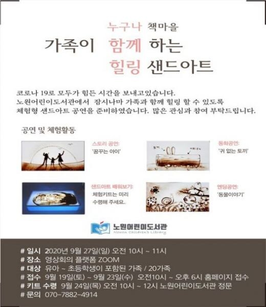 먼저, 노원어린이도서관은 오는 27일 ‘가족과 함께 하는 힐링샌드아트’ 강좌를 운영한다.