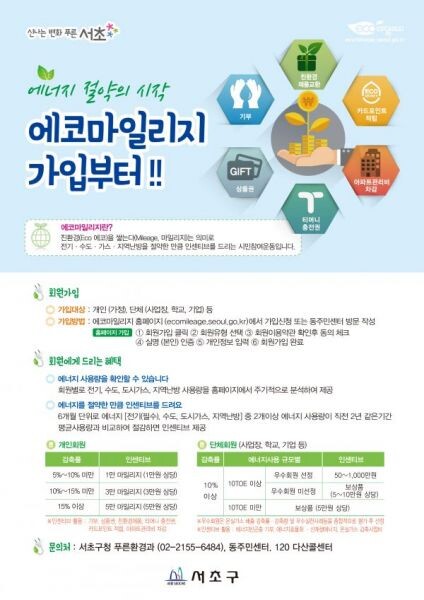 에코마일리지 가입을 희망하는 가정 및 단체는 에코마일리지 홈페이지를 통해 인터넷으로 가입하거나, 서초구청 푸른환경과 및 가까운 동주민센터에 방문해 신청하면 된다.