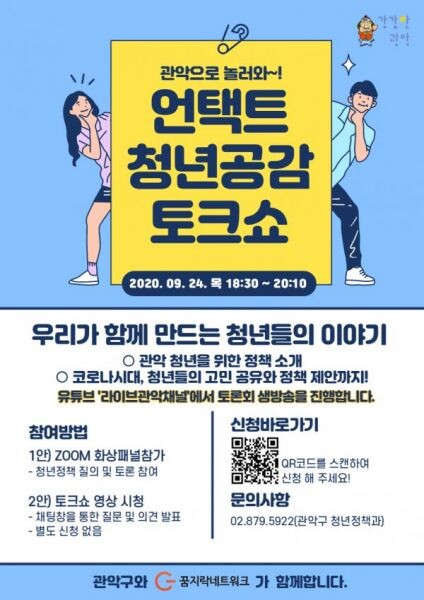 ‘언택트 청년공감토크쇼’는 서울에서 거주하거나 생활하는 만 19세~39세 청년이면 누구나 참여 가능하며 ZOOM앱으로 온라인 패널 참여를 원하는 청년은 오는 22일까지 관악구청 홈페이지를 확인해 QR코드로 신청할 수 있다.