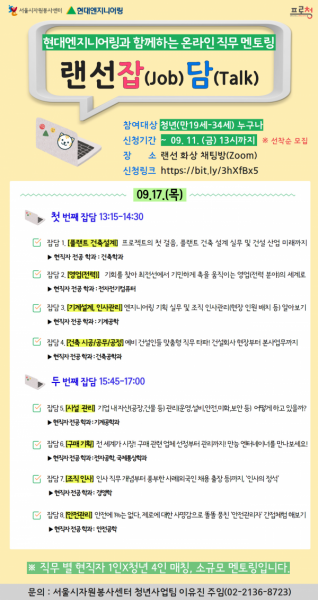 이어 서울시자원봉사센터는 9월 17일 현대엔지니어링과 손을 잡고 온라인 플랫폼 Zoom에서 청년 60여명을 대상으로 ‘랜선잡담’을 개최했다고 밝혔다.