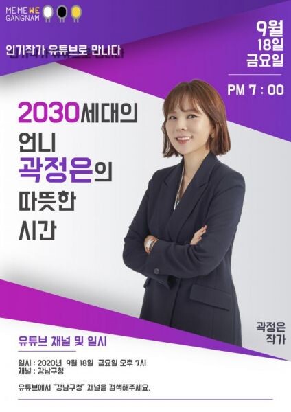[무한뉴스] ‘기분 좋은 변화, 품격 있는 강남’을 실현 중인 강남구가 자살예방의 날 기념 주간을 맞아 18일 작가 겸 방송인 곽정은의 강좌를 시작으로 ‘코로나블루’ 극복을 돕는 온라인 프로그램을 연말까지 진행한다.