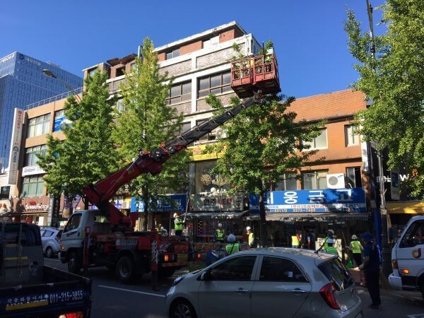 고소작업차를 이용한 작업은 주로 간선도로변에서 실시하고 차량 진입이 어려운 곳은 기동반이 투입돼 수작업을 펼친다.