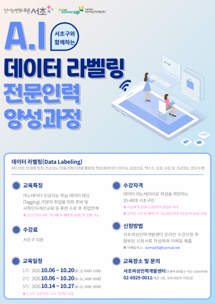 [무한뉴스] 서울 서초구가 코로나19로 인해 취업이 어려워진 청년 구직자를 위해 4차 산업혁명으로 떠오르고 있는 새로운 직업군인 ‘AI 데이터라벨링’ 전문인력 양성과정을 오는 10월6일부터 운영한다고 밝혔다.