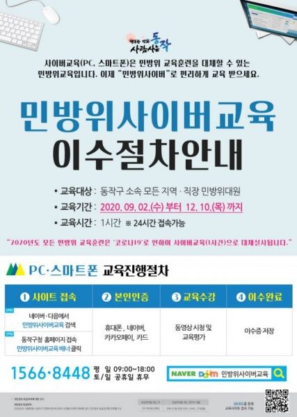 PC 또는 스마트폰을 이용해 민방위사이버교육 또는 동작구청 홈페이지 '민방위사이버교육' 배너를 통해 접속 후 본인 인증을 거치면 수강이 가능하다.