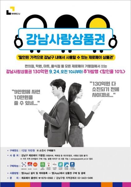 이번 추가 발행되는 강남사랑상품권은 1만원·5만원·10만원권 등 3가지로 구성돼 있으며 1인당 월 70만원 한도 내에서 할인된 금액으로 구매할 수 있다.