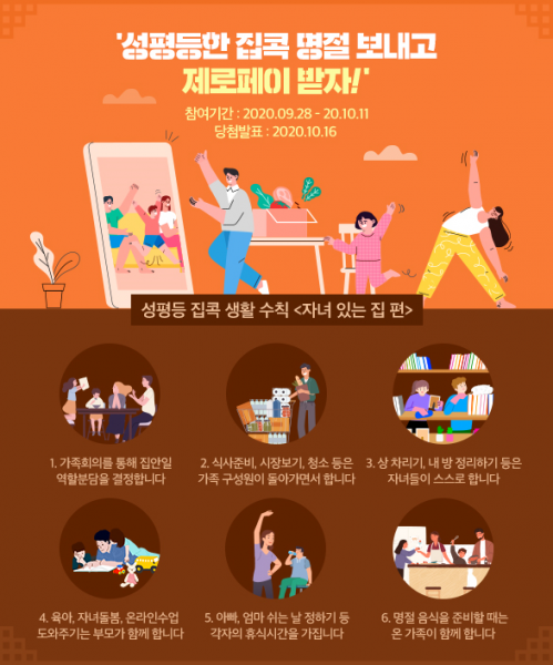 캠페인은 ‘성평등한 집콕생활 수칙 맞추기 OX퀴즈’와 ‘성평등한 집콕명절 모습 인증샷 SNS 공유하기’를 오는 9월 28일~10월 11일 2주간 동시에 진행한다.