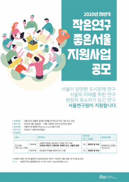 [무한뉴스] 서울연구원은 오는 25일부터 10월 15일 오후 6시까지 2020년 하반기‘작은연구 좋은서울’지원사업 공모를 진행한다.