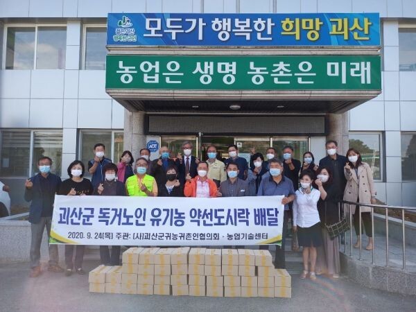[무한뉴스] 충북 괴산군 농업기술센터는 괴산군귀농귀촌인협의회와 힘을 모아 신종 코로나바이러스 감염증으로 외출이 어려운 관내 11개 읍·면 독거노인 200명에게 유기농 약선 도시락을 배달했다고 24일 밝혔다.