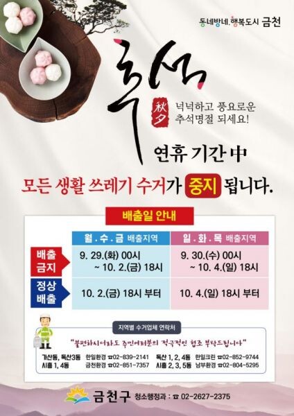 [무한뉴스] 금천구가 추석 연휴 기간 폐기물처리시설 및 청소대행업체가 휴무에 들어감에 따라 생활쓰레기를 수거하지 않는다고 밝혔다.