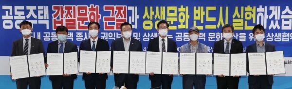 전국아파트입주자대표회의연합회 충남지부를 비롯한 공동주택 당사자는 상호 존중과 신뢰를 기반으로 하는 갑질 대응체계 도입과 입주민 인식개선, 근로조건 보호 등을 위해 노력하기로 했다.