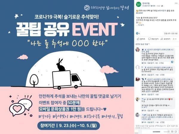 참여방법은 오는 10월 5일까지 강서구청 페이스북에 접속해 해당 이벤트 게시물에 ‘안전하게 추석을 보내는 나만의 꿀팁’을 댓글로 달면 된다.