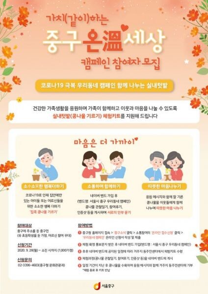 참여대상은 중구에 주소를 둔 중구민으로 유·초등학생을 둔 가정이나 어르신을 우선 선발한다.