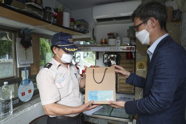 이에 구는 25일 요양보호사 등 돌봄인력과 마을버스 기사, 청소·경비 노동자 등 관내 필수노동자 5500명에게 마스크와 손소독제, 격려편지를 넣은 방역물품 세트를 전달했다.