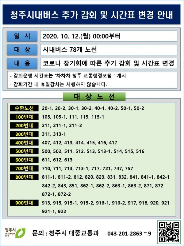 시 관계자는 “사상 초유의 코로나19 사태로 청주시 시내버스의 감회운행 지속과 이번 추가 감회 결정은 불가피한 선택이었다”며“대중교통 이용에 불편이 생기더라도 시민 여러분들의 너그러운 이해를 부탁드린다”고 말했다.