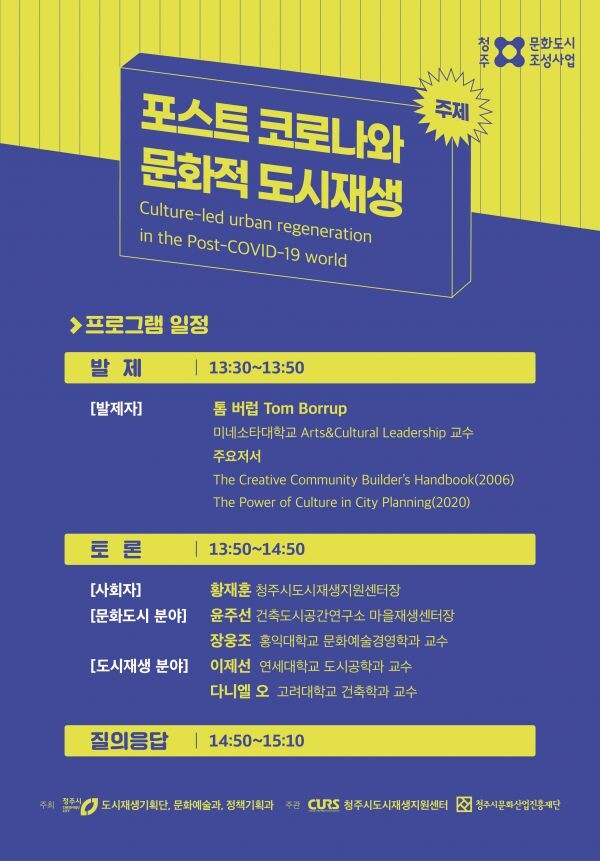 청주시와 청주시문화산업진흥재단 문화도시센터는 7일 오후 1시 30분에 온라인으로 [도시재생×문화도시] 심포지엄을 개최한다.