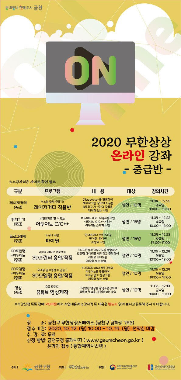 이번 강좌는 8월에 개설한 기초반 강좌에 이어 수강생들이 단계별 학습을 통해 전문지식을 습득할 수 있도록 3D프린팅 3D모델링 유튜브 영상 제작 아두이노 파이썬 레이저커터 등 중급과정으로 구성됐다.