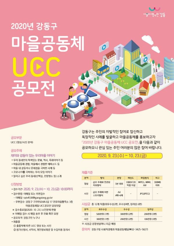이정훈 강동구청장은 “2020년 강동구 마을공동체 UCC공모전에 우리 이웃과 동네의 이야기를 담은 작품이 많이 응모되어 강동구 마을이야기가 풍성해지면 좋을 것”이라며 “마을공동체 사업을 통해 구민 모두가 행복해지는 강동구를 만들어 가겠다”고 말했다.