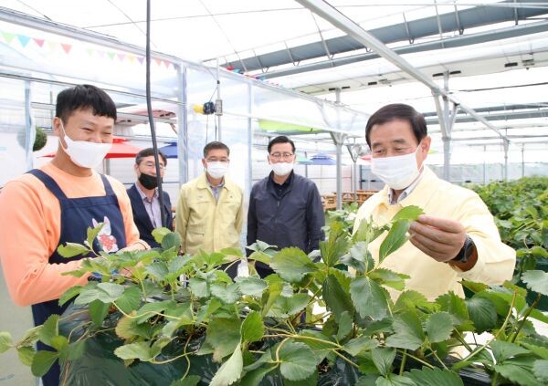 조 시장은 이날 금가면 오석리에서 스마트폰으로 시설하우스의 온도, 습도, 양분 환경을 조절해 고품질 딸기를 생산하는 ‘아론딸기 농원’을 방문했다.