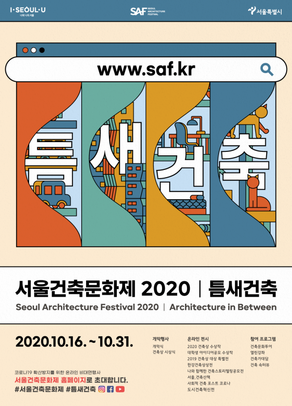 행사가 시작되는 10월 16일부터 10월 31일까지 서울건축문화제 홈페이지를 통해 온라인 전시와 강연, 현장영상 등 다양한 프로그램들을 업로드해 직접 방문 없이 랜선을 통해 모두와 함께할 수 있도록 한다.