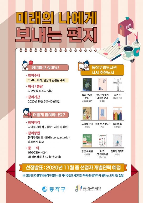 대상은 도서관에 관심 있는 지역주민이며 코로나·미래·일상과 관련된 주제로 형식의 제한 없이 400자 이상 분량의 편지글을 작성해 응모하면 된다.