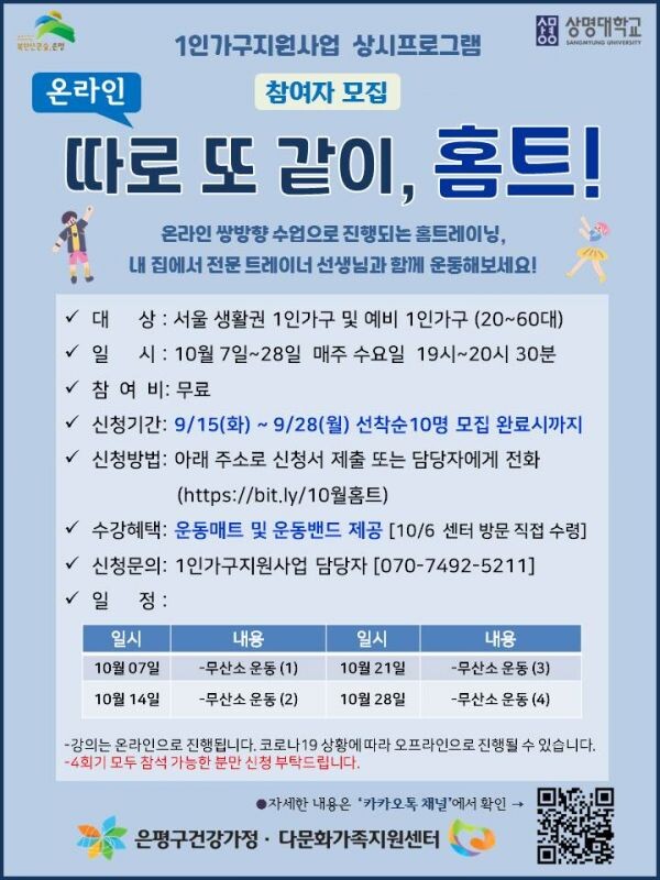 10월에는 전문 트레이너와 함께 운동할 수 있는 따로 또 같이, 홈트, 천연 재료로 생활용품을 직접 만들어보는 천연 생활용품 만들기, 요리활동을 통한 소통과 미래를 위한 생애설계를 해보는 슬기로운 1인생활을 실시간 쌍방향 온라인으로 진행한다.