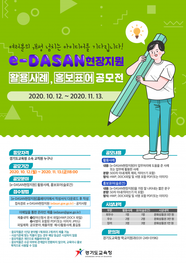 도교육청 조한일 학교지원과장은 “당선작은 ‘e-DASAN현장지원’ 홍보를 위해 활용하고 이번 공모를 통해 더 많은 교직원이 시스템을 사용하길 바란다”며 “학교 자율 경영을 활성화하고 교직원 역량을 높이기 위해 적극 지원하는 ‘e-DASAN현장지원’이 되겠다”고 말했다.