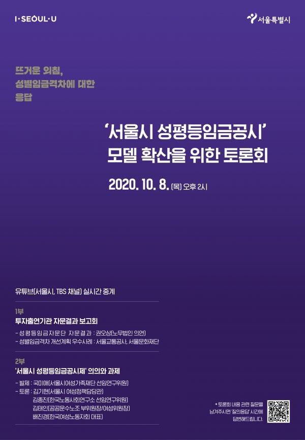 ‘뜨거운 외침, 성별임금격차에 대한 응답’이라는 부제로 코로나-19 감염 예방을 위해 무관중 토론회로 진행하며 서울시 및 TBS 유튜브 채널을 통해 실시간 중계한다.