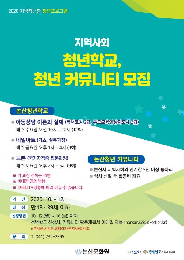 논산 청년학교·커뮤니티는 만 39세 이하의 논산시민 또는 충남도민일 경우 참여가능하며 오는 12일부터 16일까지 논산문화원 홈페이지에서 신청서를 받아 이메일로 제출하면 된다.