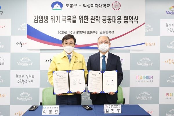 10월 8일 도봉구청에서 협약한 ‘감염병 재난 위기 극복을 위한 공동대응 협약’은 2021학년도 입시 전형을 위해 덕성여대에 방문하는 수험생, 학부모와 지역 주민들의 안전을 지키고자 맺어졌다.