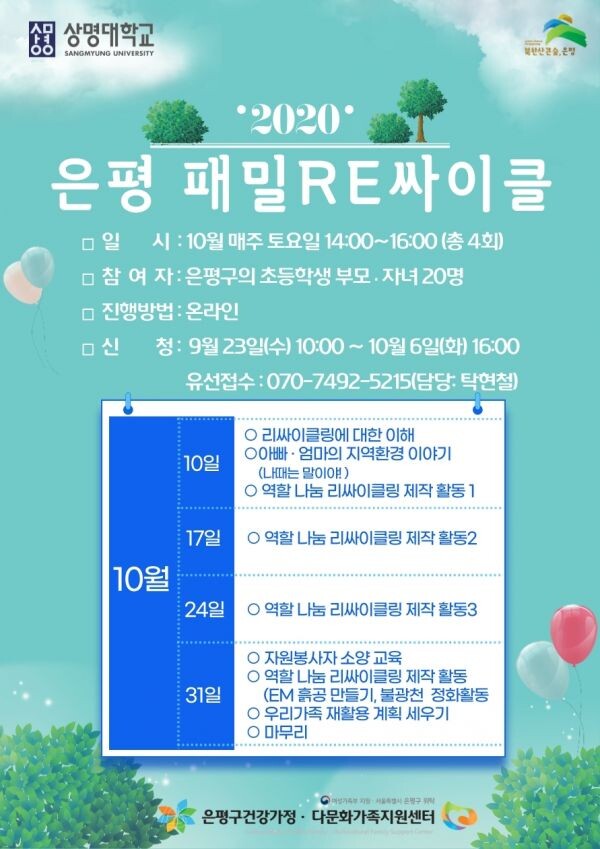 10월 매주 토요일 오후 2시~오후 4시시에 리사이클링 이해와 제작, 아빠엄마의 지역사회 환경 이야기, 리사이클링 제작 활동, EM흙공을 이용한 불광천 정화활동, 우리 가족의 재활용품 계획이 진행될 예정이다.