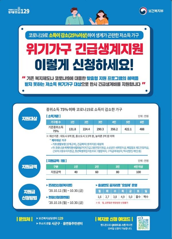 긴급생계지원금 대상자는 코로나19로 인해 가구 소득이 25% 이상 감소하고 가구원 전체소득의 합이 기준 중위소득 75% 이하이며 대도시 기준 재산이 6억원 이하인 가구다.