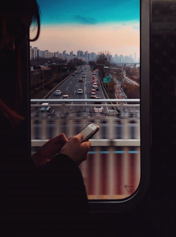 전동차 차창에 기대 스마트폰을 바라보는 시민과 함께 차창 너머로 보이는 저녁 무렵 서울의 모습이 인상적인 사진이다.