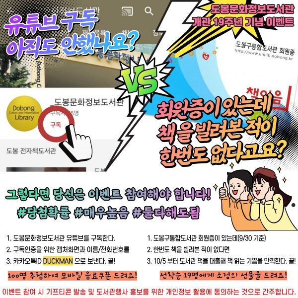 이와 함께 도봉문화정보도서관의 유튜브 채널 구독자를 위한 이벤트도 시행한다.