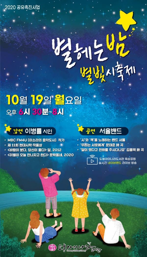 이에 지역의 숨어있는 유휴 공간 발굴과 활용을 위해 도봉아이나라도서관 옥상에서 ‘별 헤는 밤, 별빛 시 축제’를 온라인으로 진행한다.