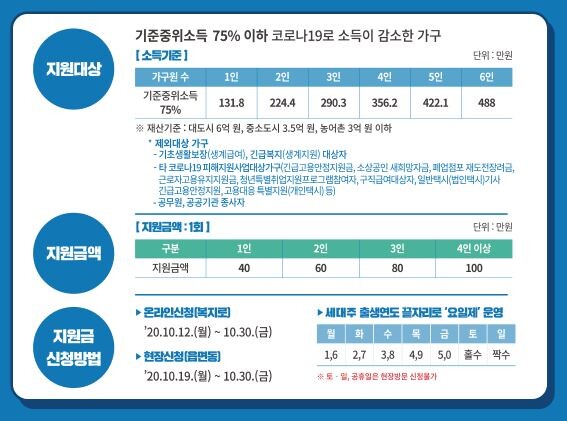 이번 지원은 정부의 2차 맞춤형 긴급생계지원금으로 지원 대상은 코로나19로 인해 가구소득이 25%이상 감소하고 가구원 전체 소득의 합이 기준 중위소득의 75% 이하이며 재산이 6억원 이하인 가구다.