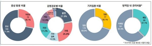 먼저 코로나19의 증상 유무에서는 총 256명의 확진자중 무증상 확진자가 72명에 이르고 있다.