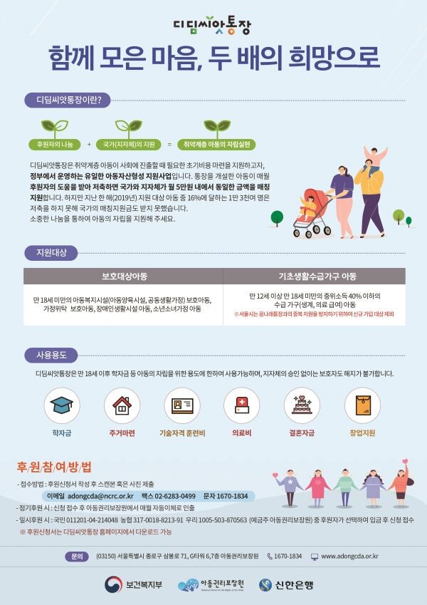 후원 신청은 디딤씨앗통장 인터넷 홈페이지 또는 전화로 하면 된다.