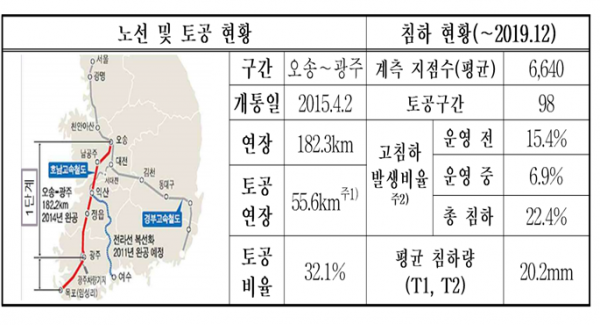 또한 호남고속선 교량과 터널 등에서도 노반 침하가 진행 중에 있었는데, 터널과 교량 55개, 연장 40.18km에서 허용침하량을 초과하는 침하가 진행 중이며 가장 침하가 큰 구간은 112mm인 것으로 드러났다.