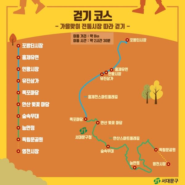 거리는 약 8km로 포방터시장∼홍제유연∼인왕시장∼유진상가∼홍제천 폭포마당∼안산 벚꽃마당∼숲속무대∼능안정∼독립문공원∼영천시장으로 이어진다.