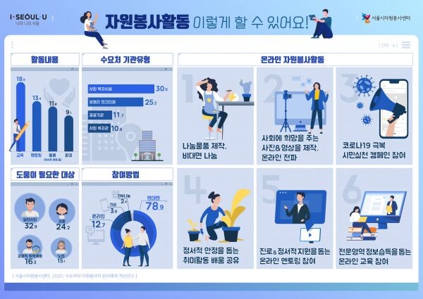 서울시자원봉사센터는 코로나19상황에서도 일상생활유지, 교육격차해소, 사회적 관계와 연대감 형성을 위한 온라인에서 참여할 수 있는 다양한 자원봉사활동을 시민들과 만들고자 시도하고 있다.