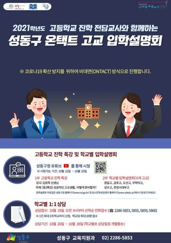 이번 설명회는 코로나19 확산방지를 위해 비대면 온라인으로 진행되며 성동구 관내에 위치한 6개 인문계 고등학교가 공동 참여해 고교진학 특강과 학교별입학설명회, 학교별 1대1 상담으로 구성했다.