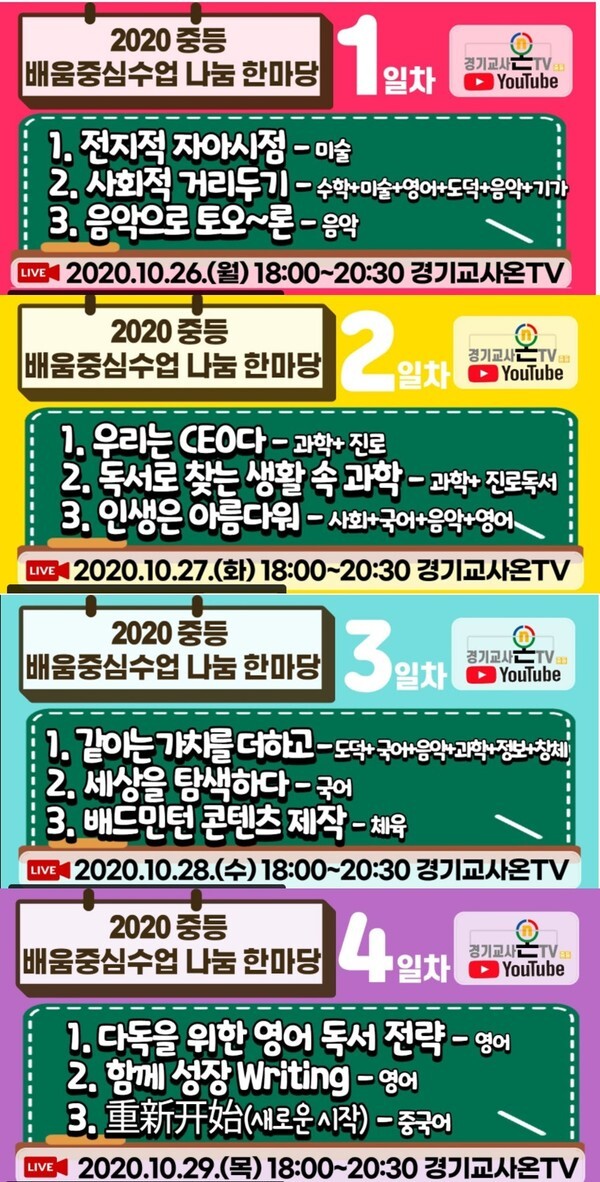 [무한뉴스] 경기도교육청이 26일부터 29일까지 '2020 중등 배움 중심수업 나눔 한마당' 실시간 온라인 방송을 한다.